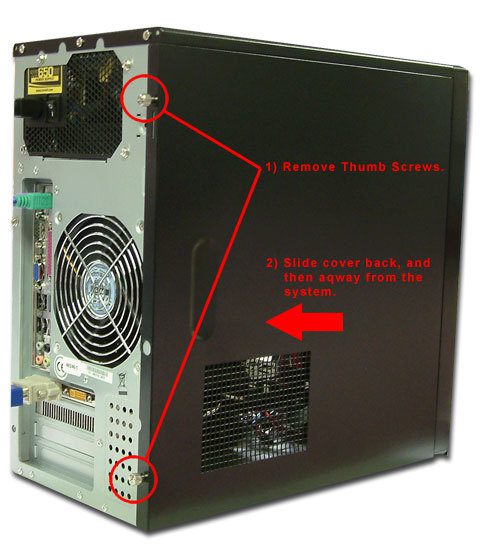 When looking at the front of your computer, we’re going to remove the panel that is on the left hand side. To do this, unfasten the screws on the back of that panel, and slide the panel off.