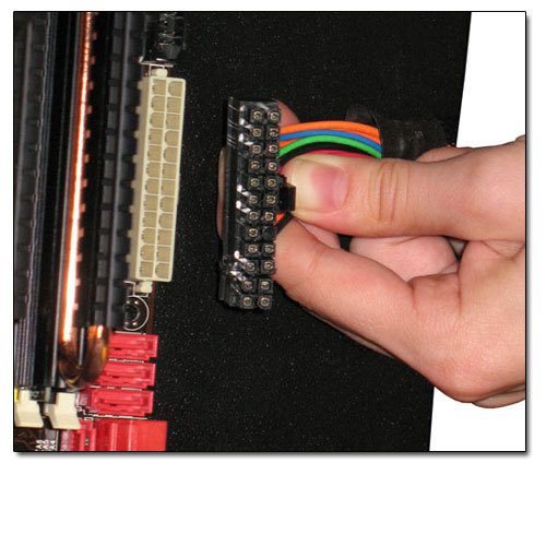 Unplug your computer from the wall. Take a look inside at your motherboard, there are two power connections that we need to check. The first is a big 24 pin cable, usually found on the right-hand side of your motherboard. It’s got a very large bundle of cables running to it, and should be easy to identify. Make sure it’s firmly connected to your motherboard.