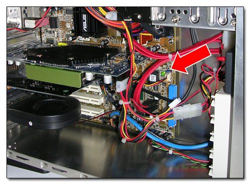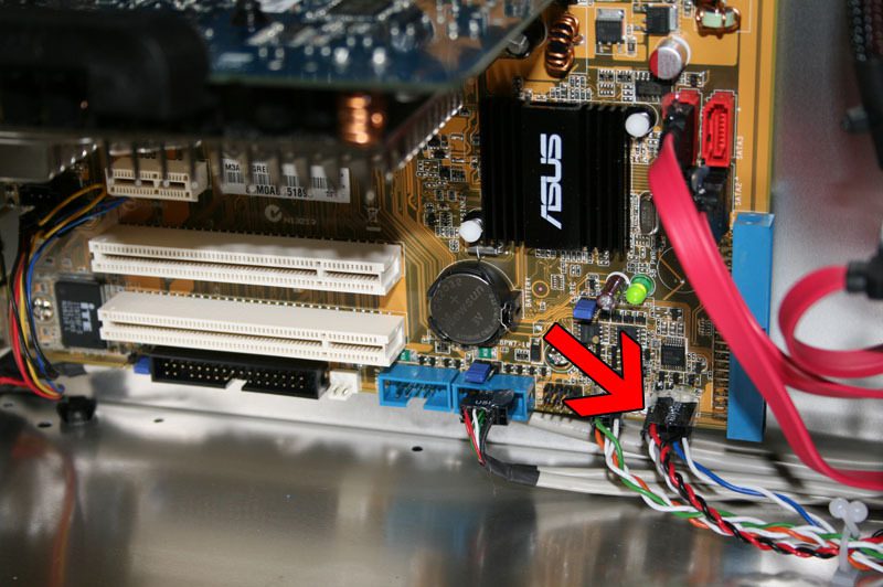 Take a look at the lower left corner of the motherboard. You’re looking for a pair of green and white twisted wires connected to some pins in the corner, as pictured here: